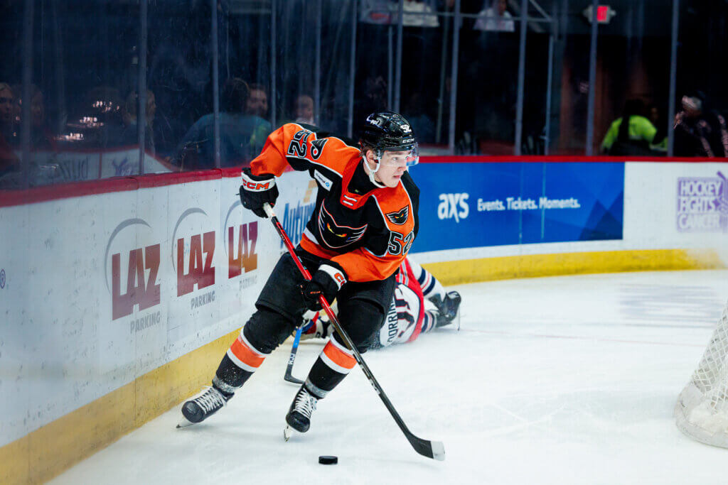 HE’S DOG GONE GOOD – Phantoms rookie Denver Barkey never stops working. And the points and goals have been piling up for the rookie forward. The 20-year-old from Newmarket, ONT scored a pair of game-winning goals last week coming through exactly when the Phantoms needed him most. He now leads the Phantoms with seven goals. Barkey scored a pivotal goal on Wednesday against Rochester right after the Americans had made it a one-goal game to gain momentum in the third period. His conversion in the slot on a setup by Christian Kyrou propelled the Phantoms to a 4-2 win. On Saturday, it was another third-period goal, this time to break a 2-2 tie at Hartford. With Alex Bump muscling his way up the right boards, Barkey drove to the net and knocked in the game-winner while being hauled down by a defender. The scrappy, undersized winger was a Round 3 selection of the Philadelphia Flyers in 2023 and was the leading scorer for the London Knights during last year’s Memorial Cup championship run.