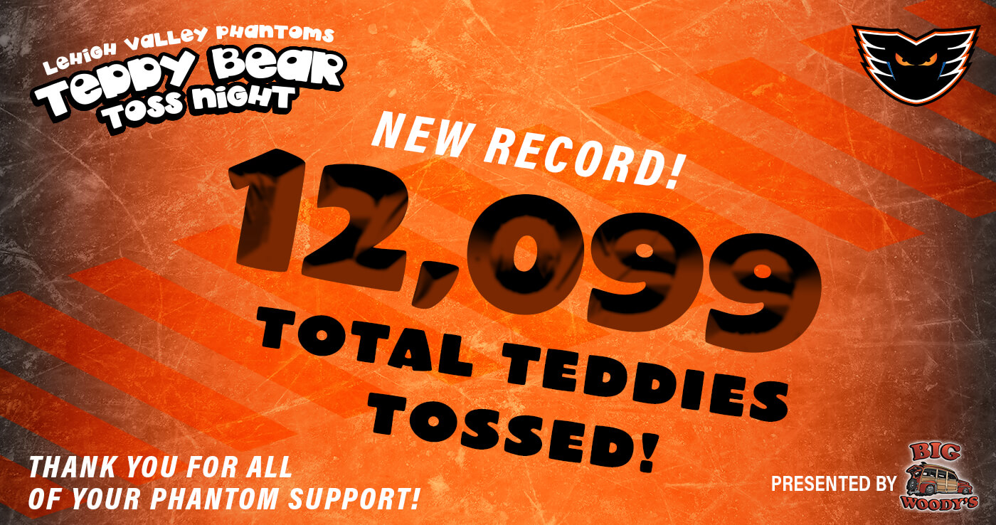 The Lehigh Valley Phantoms set a new record with 12,099 stuffed animals in the annual Teddy Bear Toss game at PPL Center. Lane Pederson’s goal on the power play at 2:11 into the second period triggered the chaotic scene. Today was the official count and delivery. By a slim margin of 146 teddy bears, the team set a new record, breaking last year’s mark of 11,853 stuffed animals. That brings the grand total to over 80,000 teddy bears since the team’s first Teddy Bear Toss in 2014.