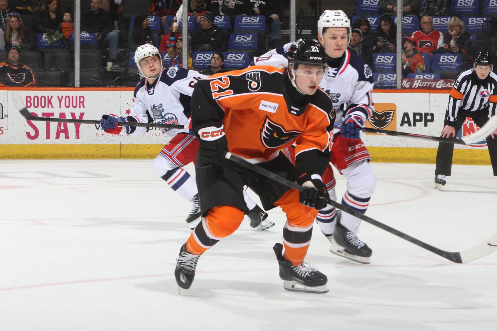 Jacob Gaucher dug a puck away along the board at the blue line and drove deep before a snazzy backhand flick around a chasing defender to a hustling Marody down the middle who buried his blast for his second goal in his last two games as well as his third goal in his most recent four contests. Despite being outshot 13-4 in the second period, the Phantoms emerged from the second period with a 4-2 lead.