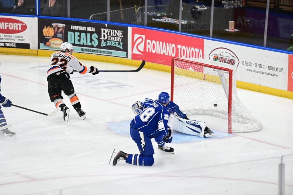 Syracuse, NY – Aleksei Kolosov had possibly the best game of his career in a career-high 39-save performance to backstop the Phantoms to a hard-earned 4-1 victory at the Syracuse Crunch on Friday night. Kolosov faced 22 shots in the first period, the most allowed in a single period by Lehigh Valley this season, and never looked back as he repelled one point-blank chance after another after another.