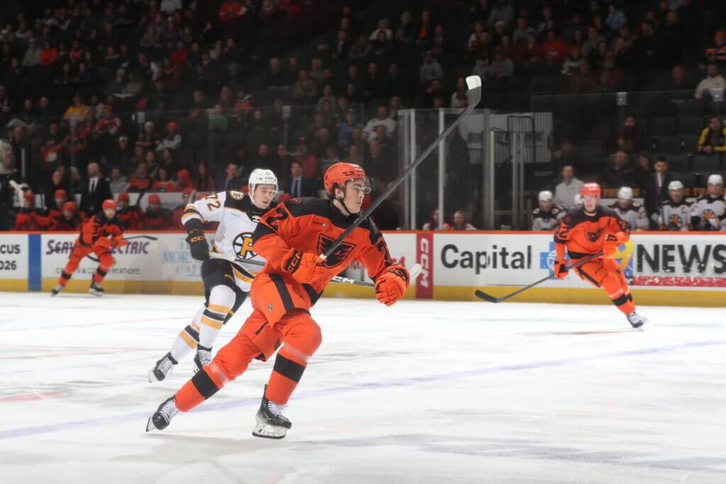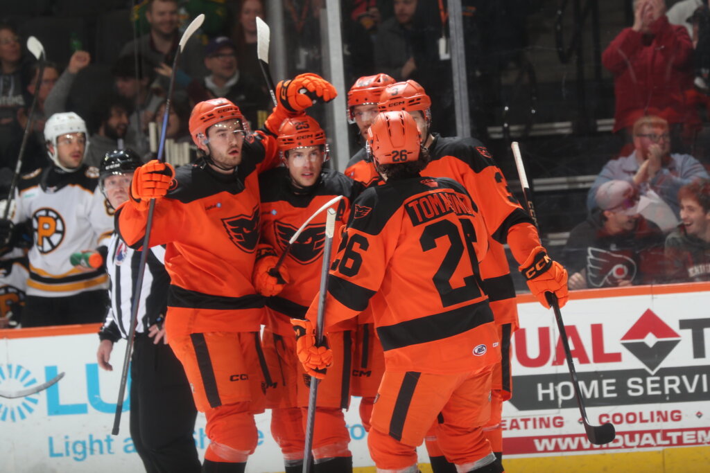 Allentown, PA – The best team in the AHL and the top goaltender in the circuit were no match for the Lehigh Valley Phantoms in a midweek clash at PPL Center as the Providence Bruins surrendered a season-high for goals in a 6-3 victory for the Orange and Black on Wednesday night. Lane Pederson (22nd) led the way with three points (1G, 2A) while David Jiricek (2nd with LV) also had a multi-point game and Brett Harrison (2nd with LV) rushed in to score a goal against his former team in an 11-second sequence that boosted a 1-0 lead up to 3-0. And Christian Kyrou (9th) made his debut at forward a memorable one with a breakaway goal.