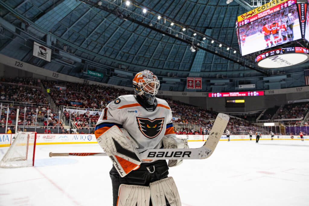 Charlotte, NC – Yaniv Perets was incredible in just his fourth game of the season with the Phantoms. He knocked aside or absorbed everything the Charlotte Checkers threw at him in a 2-0 victory on Saturday afternoon in the second-to-last game of the regular season.