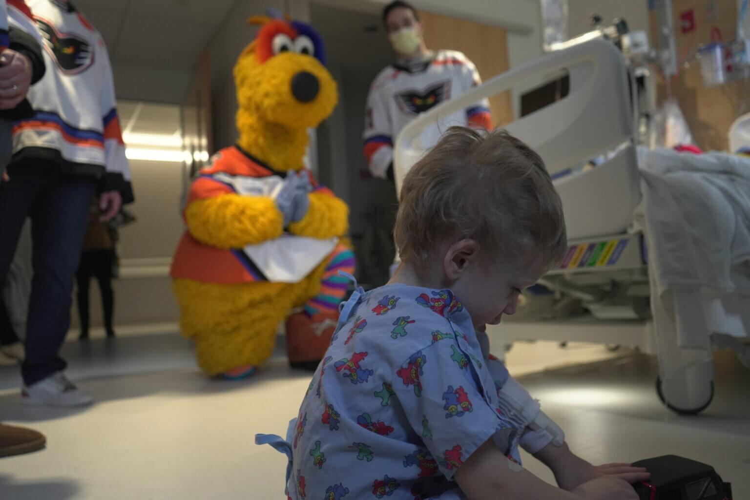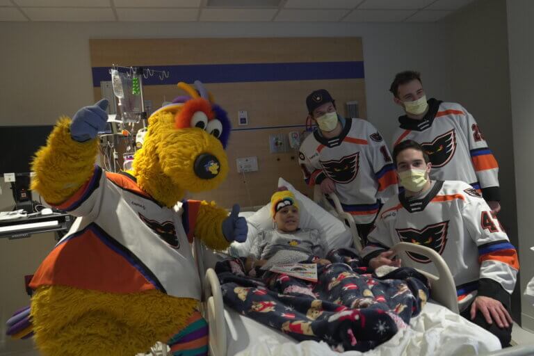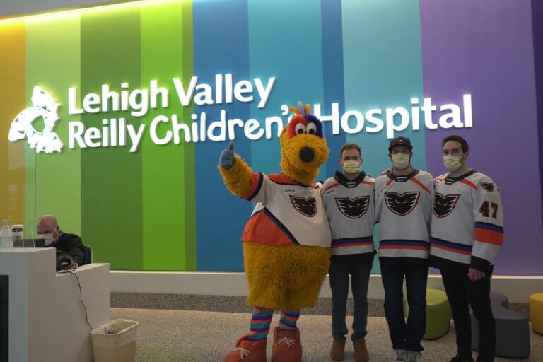 Phantoms players Louie Belpedio, Troy Grosenick, Cooper Marody, and mascot meLVin visited Lehigh Valley Reilly Children’s Hospital on January 24 to bring joy to young patients. Together, they delivered gift bags filled with stickers, a meLVin trading card, and a special meLVin hat — a giveaway item from the team’s upcoming game on January 28.