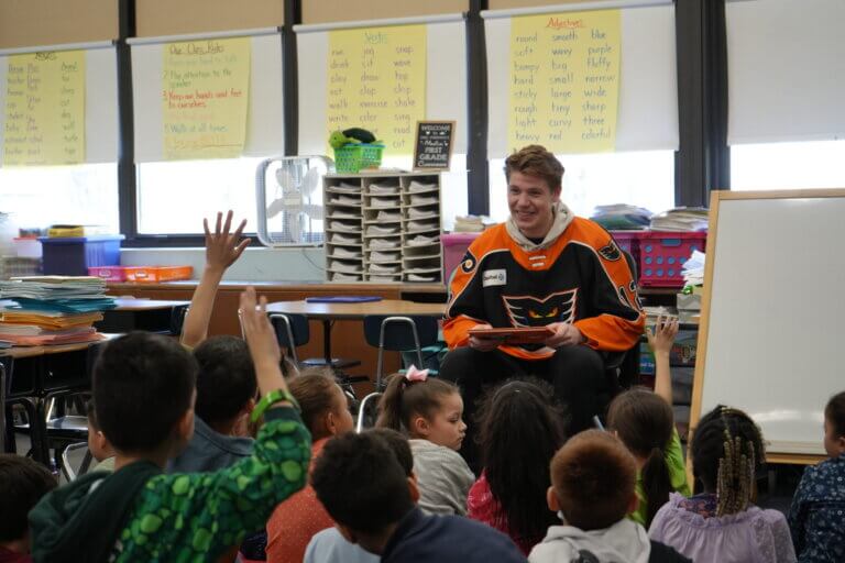 After reading, players handed out Phantoms pencils, signed autographs, and answered questions about the game before taking photos with each class. Many stayed longer than expected to meet teachers and students throughout the schools. These visits are part of a growing collaboration between the Lehigh Valley Phantoms and Phantoms Charities presented by Air Products, with more reading visits planned throughout the 2023–24 season to reward improved academic performance and promote literacy.