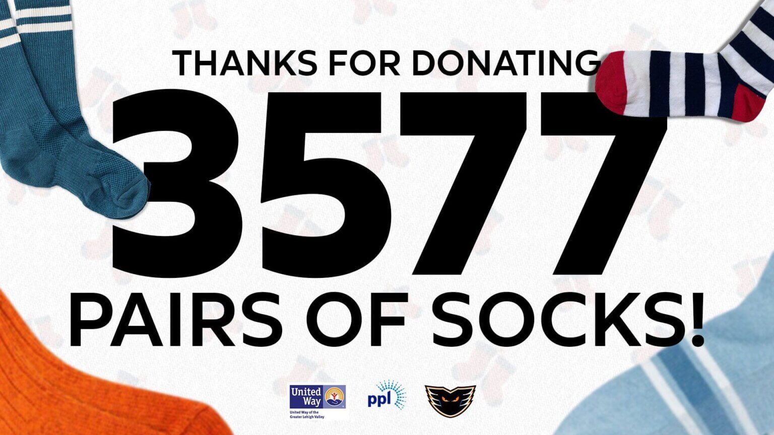 In collaboration with the United Way of the Greater Lehigh Valley and the PPL Foundation, the Phantoms collected 3,577 pairs of socks through their “Be a Housing Hero” campaign. The initiative supports homeless and financially unstable families across the region, where more than 44% face difficult daily decisions like whether to pay rent or buy groceries.