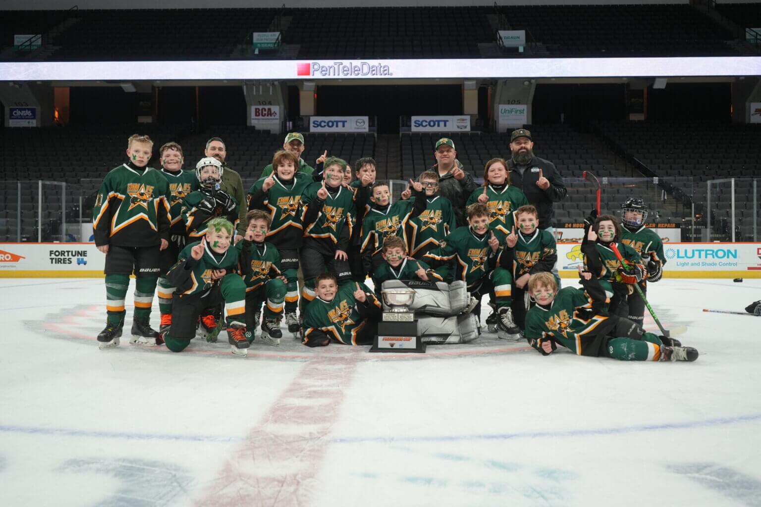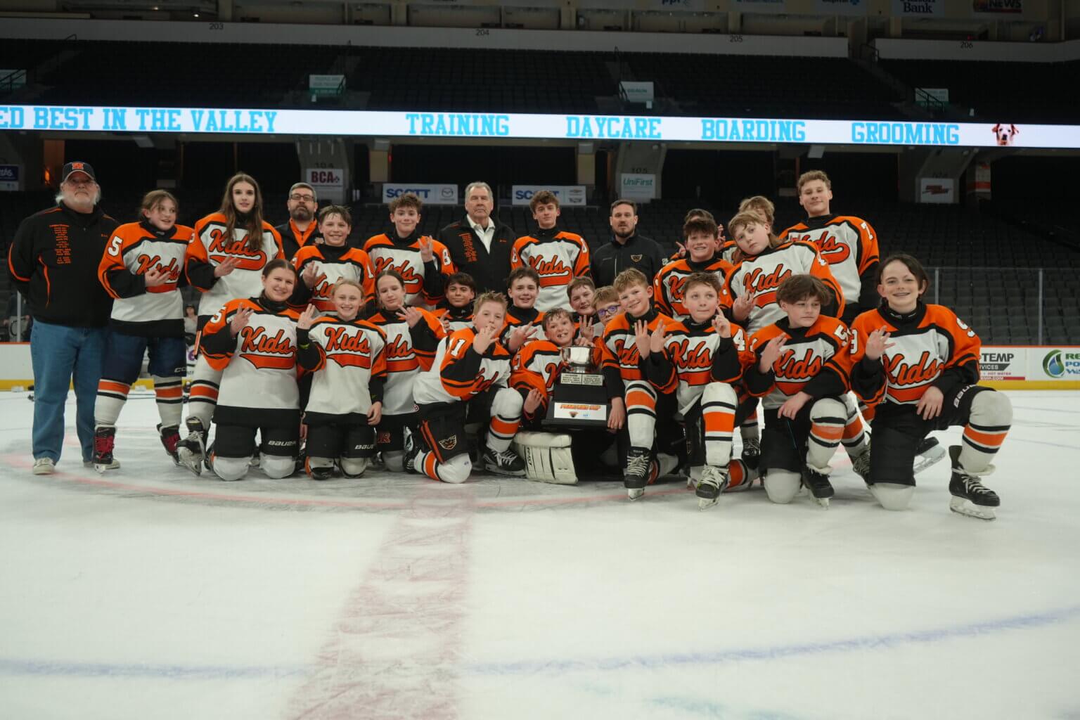 After a high scoring matchup at PPL Center, the Northampton Konkrete Kids keep their winning ways and become the Middle School Division Phantoms Cup Champions 8-5! This win however was not without a strong effort. For a portion of the game, both Northampton and Easton shared the scoring. In the first period, MJ Norwood and Rocco Annunziata scored for Easton while Anthony Noti, Deegan Berry, and Doug List scored for Northampton making it a 3-2 lead for the Kids. In the second, Jaxson Gibbons tied the game for Easton, but Carter Huber had something to say about that. Huber tucked in two goals for Northampton making it a 5-3 lead for the Kids. Blake Flowers and Doug Lisk added to the Konkrete Kids lead during the third. Luke Anastasio and Mason Fratantoro scored for Easton but it wasn’t enough for the Red Rovers to make a comeback. As the final seconds ticked off the clock, gloves, helmets, and sticks went flying into the air. A well deserved victory for Northampton as they win 8 straight games to end this year. They are back to back Phantoms Cup Champions!