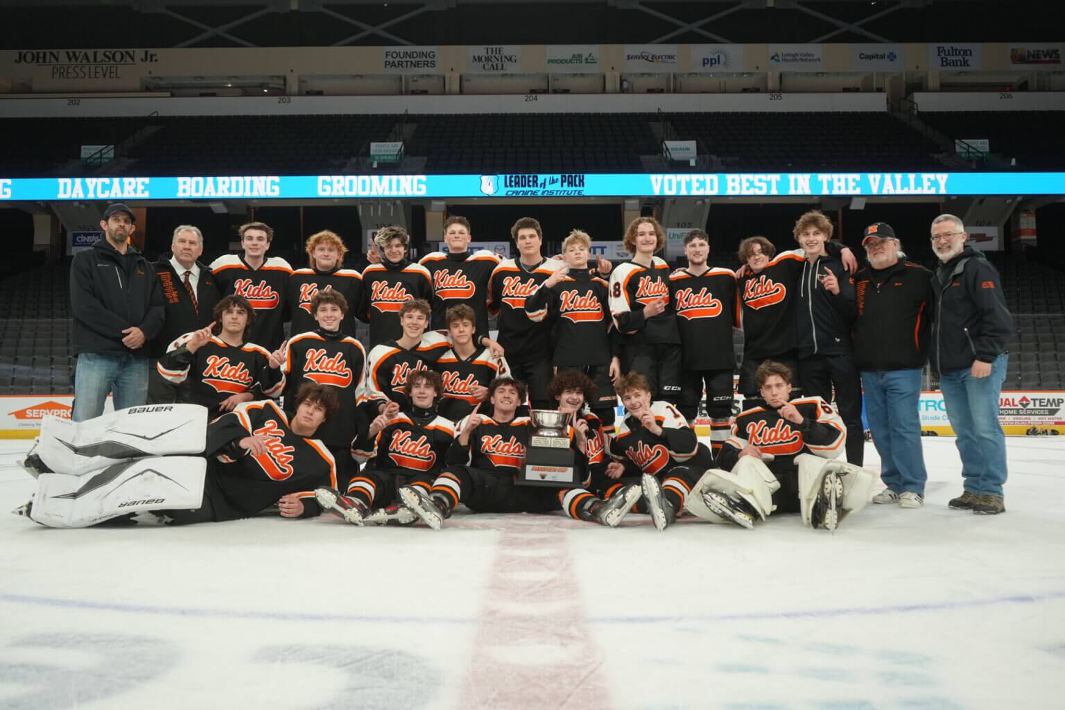 The Northampton Konkrete Kids are kings of the Phantoms Cup in the Elementary Division after defeating Parkland 9-4 on Tuesday night. Hat tricks from Nate Bryan and Logan Pile led the way for the Konkrete Kids offensively, while netminder Greyson Dolan made some spectacular saves in the crease to contain Parkland’s open scoring chances. Blake Jacoby, Sawyer Repetz, and Finnegan McGinley all added goals as well for Northampton in the win. Early on, the Northampton offense exploded in the first period, outscoring Parkland 6-1 which included a natural hat trick from Bryan. The Trojans would show signs of life in the second while down 7-1, as Reid Messa found the back of the net twice and would later complete a hat trick of his own in the third. However, the Kids proved to be too much as they pulled away with a large lead and the championship glory that came as the final horn sounded. “I’m ecstatic for the kids, I’m happy for the parents that have stuck with us since the kids were small,” coach Brian Ruff exclaimed after the win, “They stuck with the program and believe in what they’re doing and what we’re doing out there. This whole championship is as much for the parents as it is for the kids and for us.”