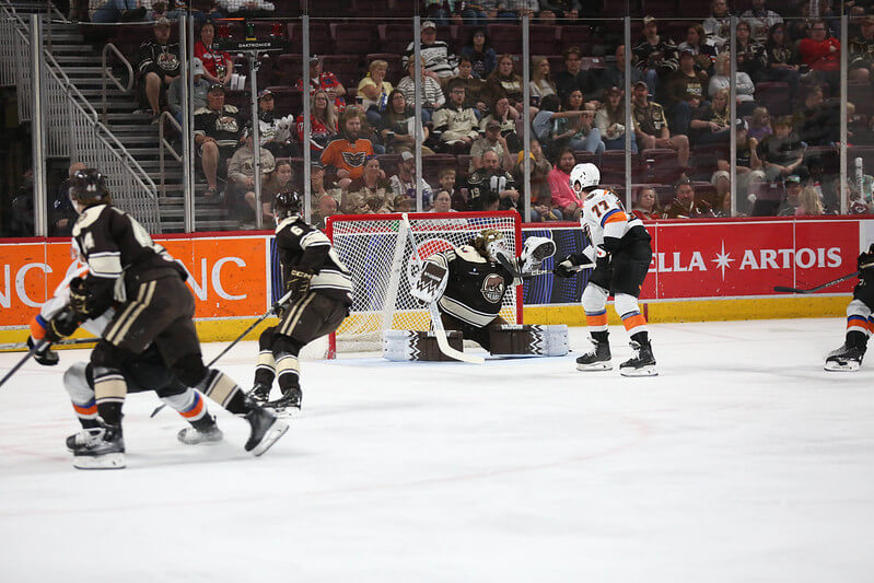 Hershey drew first blood midway through the first period as part of a delayed penalty. With the goalie pulled at 6-on-5, the Bears connected with open defenseman Chase Priskie beneath the left dot who scored past Parker Gahagen for a 1-0 lead at 9:16 into the game assisted by Pierrick Dube and Jake Massie.