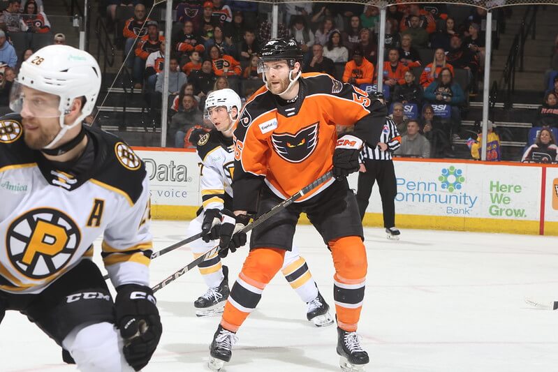 Lehigh Valley (31-25-7) had a huge opportunity to take early control of the game when the Bruins were assessed three consecutive penalties. But the Phantoms had a difficult time generating chances with their multiple power plays. Nikita Grebenkin’s bid on the backdoor on a cross-ice pass from Jacob Gaucher was killed by the stick of defenseman Billy Sweezey. Gendron had a blast from the high slot that DiPietro fought off on his blocker side.