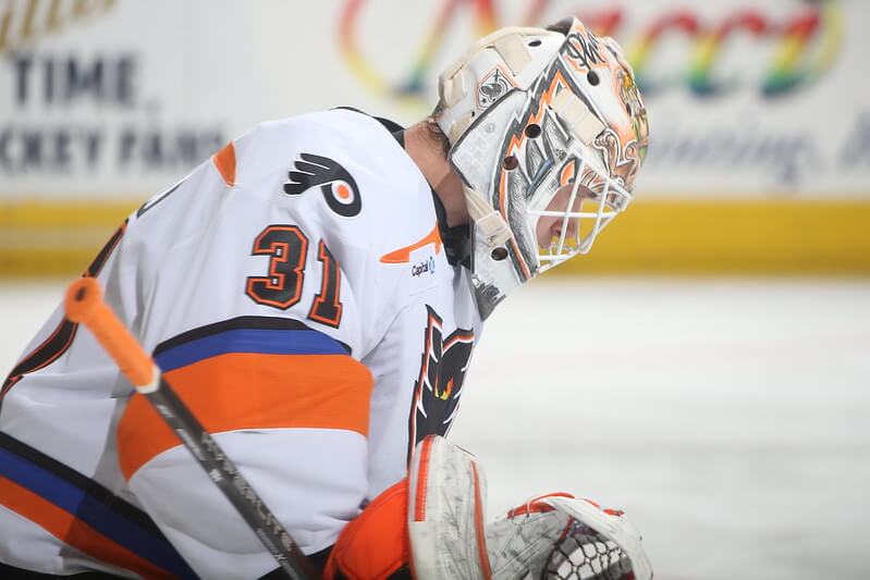 Lehigh Valley (13-12-5) almost equalized in the opening minutes of the second period when Emil Andrae’s shot from the high slot deflected off Dreidger and then up in the air and then off the top and front of the crossbar. The loose puck laid in the right-wing side of the crease with Jacob Gacuher trying to knock it home from inches away but Dreidger barely got his left pad to it first to kill the opportunity.