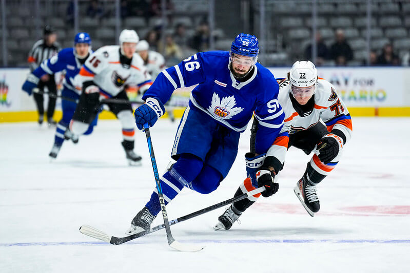 The second period was a different story. The Marlies racked up four goals in 11 minutes in a middle-stanza onslaught that had the Phantoms scrambling. Kokkonen connected just 28 seconds in and then Nick Abruzzese (6th) scored during a net-front scramble with Petersen also coming up with the save. Alex Steeves (13th) took advantage of a blue-line turnover to bury a breakaway beauty past Petersen at 6:58 to extend his goal streak to five games. Kokkonen’s second goal at 10:34 put the Marlies ahead at 4-2.