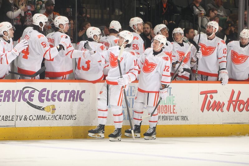 In the second period, sound structure and gritty forechecking led to the Phantoms’ equalizer. At 3:32, Smith received a perfect pass from Elliot Desnoyers stationed beneath the goal line, and Smith converted his first as a Phantom from the side of the net.
