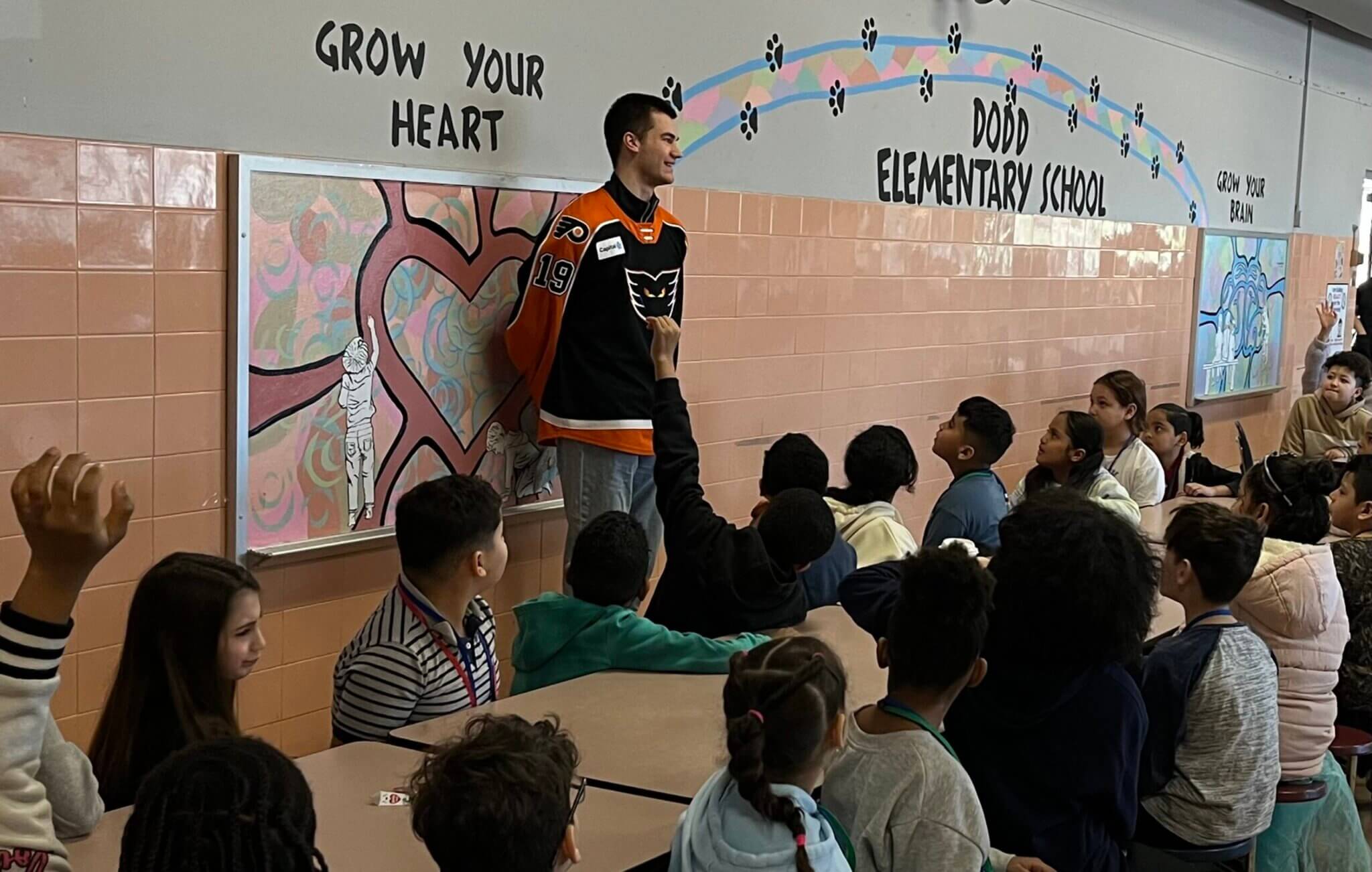 His immediate involvement throughout the season featured appearances at numerous schools including a book-reading and Q&A session with students at Hiram W. Dodd Elementary as well as participating in ball hockey sessions with students at Lincoln Elementary.