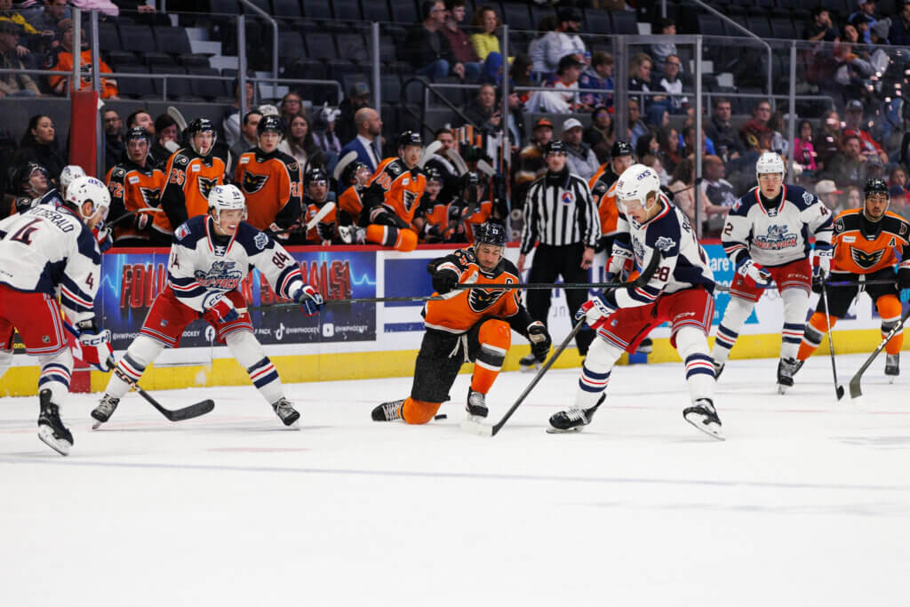 Rooebroeck’s pass from the left wing corner bounded off a Phantoms’ leg and onto the stick of Gabe Perrault (5th) in the slot who extended his goal streak to four consecutive games at 4:08 into the final period for Hartford’s first lead of the game at 3-2.