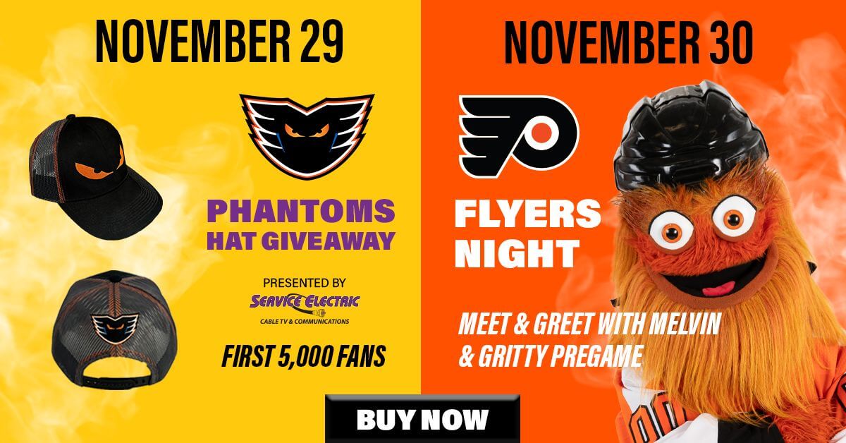 The Phantoms return to PPL Center over Thanksgiving Weekend with Phantoms Ballcap Night on Friday presented by Service Electric when the Phantoms take on the rival Hershey Bears. Saturday against the Laval Rocket features an appearance by GRITTY who will also be available for a pregame Meet and Greet.
