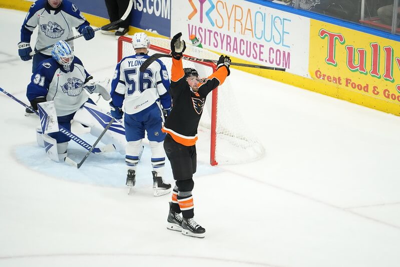 Overtime is Phantoms-Time! Lehigh Valley picked up its league-leading seventh overtime win of the season on Brendan Furry’s backhand flip past Brandon Halverson in a 3-2 triumph at Syracuse. Louie Belpdio’s intercept at center set up the Furry winning strike. Alexis Gendron (10th) and Helge Grans (4th) scored against the league’s top goaltender and top defense as part of a dominating first period in which the Phantoms raced out to a 2-0 lead via a 15-4 shots advantage. But the Crunch pushed back to extend their home point streak to eight games and eventually tied the contest with 16.1 seconds left on Gabe Fortier’s knock at the net-front past a solid Parker Gahagen (3-1-1) who secured the win.
