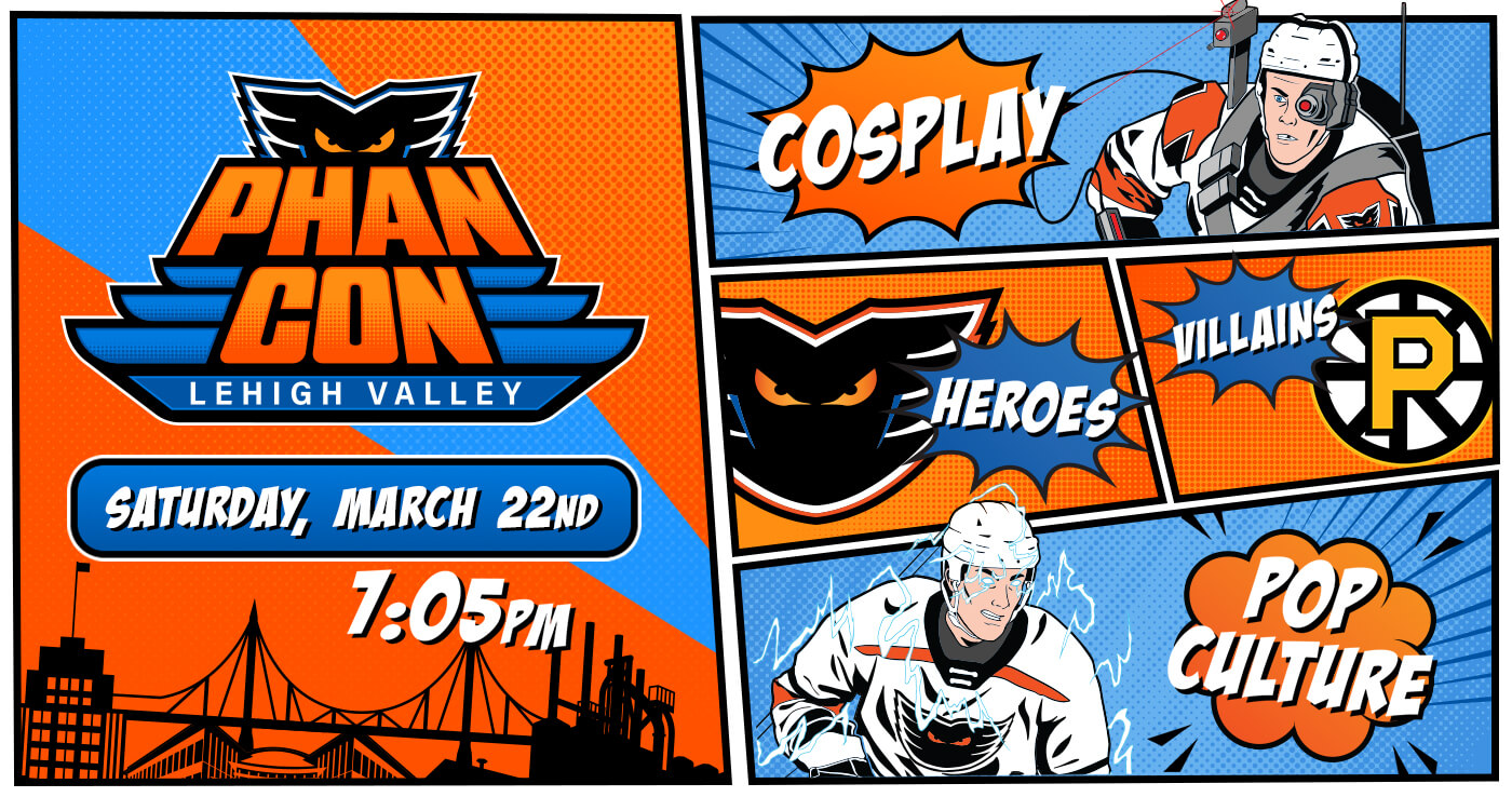 The team’s five-game homestand is the longest of the season which continues on Wednesday against the Milwaukee Admirals featuring the return of Lehigh Valley captain Cal O’Reilly. Friday and Saturday home games against the Syracuse Crunch and Providence Bruins wrap up the busy stretch. Saturday’s game includes the first-ever Phan-Con in conjunction with Lehigh Valley Comic Con featuring various heroes and super-villains at PPL Center!