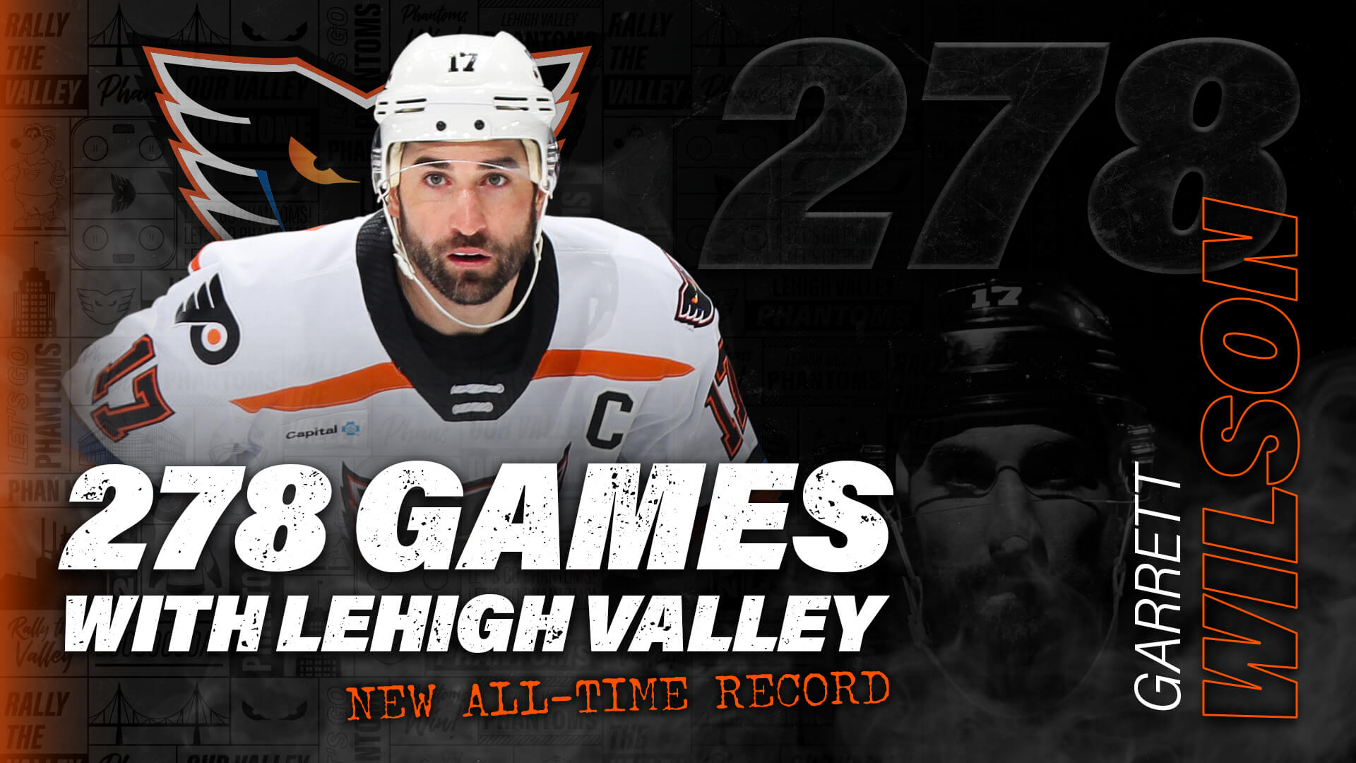 A RECORD FOR THE CAPTAIN –Lehigh Valley Phantoms captain Garrett Wilson has broken the all-time Lehigh Valley record for most games with the team by suiting up in his 278th Phantoms gameon Sunday passing Greg Carey who played 277 games with Lehigh Valley from 2016-20. Also celebrating his 34th birthday at the same time, the rugged winger has scored 57-70-124 in his five seasons with the Phantoms with 665 penalty minutes, also a Lehigh Valley record.