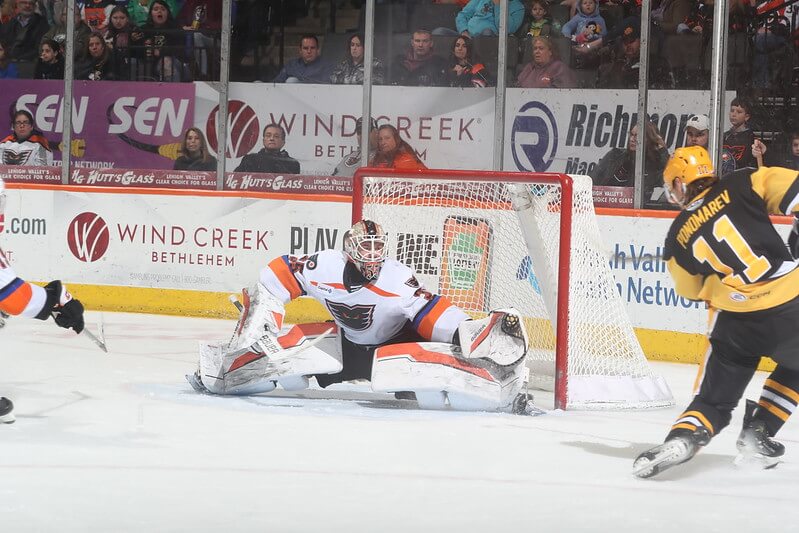 Aleksei Kolosov (27/28) had probably his best game with the Phantoms as he shined with several tremendous saves including a spectacular denial of a Penguins’ 2-on-0 at the end of the second period. Lehigh Valley pushed through for a hard-fought 3-1 win on Friday with Ethan Samson breaking a 1-1 tie in the second period. After that, it was a grind to the finish line including Kolosov’s big saves and a difficult and lengthy 5-on-3 penalty kill early in the third period. Garrett Wilson opened the scoring just 70 seconds into the contest with his 10th goal of the year for his milestone 400th career point. Zayde Wisdom capped the night on his empty-netter with just 1.4 seconds left.