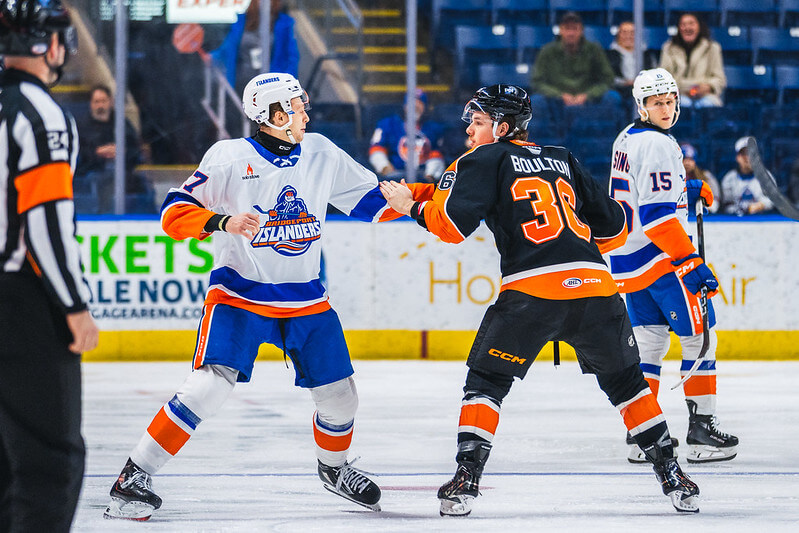 Sawyer Boulton, the son of former NHL enforcer Eric Boulton who ended his career with Bridgeport, sparked the team just three minutes into the contest as the 20-year-old rookie ruffian dropped the gloves with Bridgeport’s Riley Piercey in an impressive tilt with multiple connections from both combatants.
