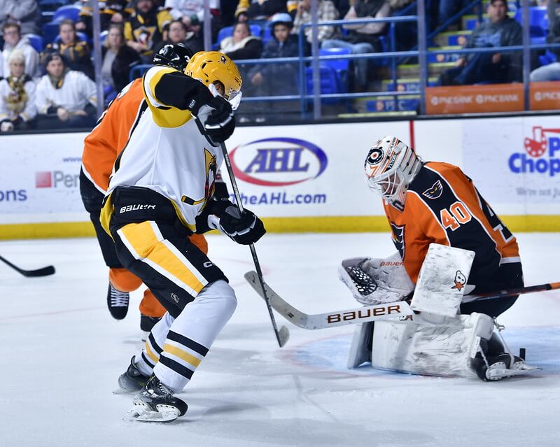 Garrett Wilson (6th) and Ethan Samson (5th) scored for the Phantoms while Tristan Broz (10th, 11th) extended his goal streak to three games while upping his season total against the Phantoms to four goals. Vasily Ponomorev (5th) scored what turned out to be the decisive strike early in the third period for the Baby Pens who are 5-1-1 overall against the Phantoms this season with still five games remaining in the rivalry series.