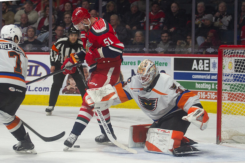 Grand Rapids surged back with an unassisted bomb from first-rounder Nate Danielson (6th) on the rush from the top of the right circle to the upper-left corner for his second goal of the weekend at 13:16.