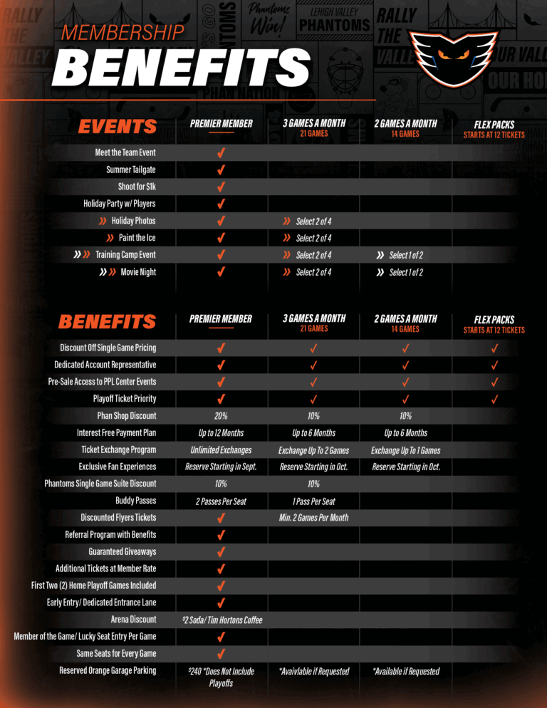 Your Premier Membership will include 2 pre-season, 36 regular season games. Additionally you will receive 2 Post Season games upon the Phantoms making the Calder Cup Playoffs. A high percentage of Phantoms home games will take place on Friday, Saturday and Sundays.